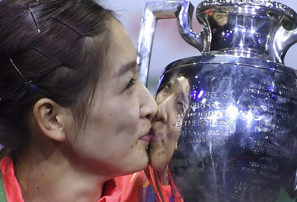2019年4月27日,刘诗雯在匈牙利布达佩斯世乒赛女单颁奖仪式上亲吻冠军奖杯。新华社记者 逯阳 摄