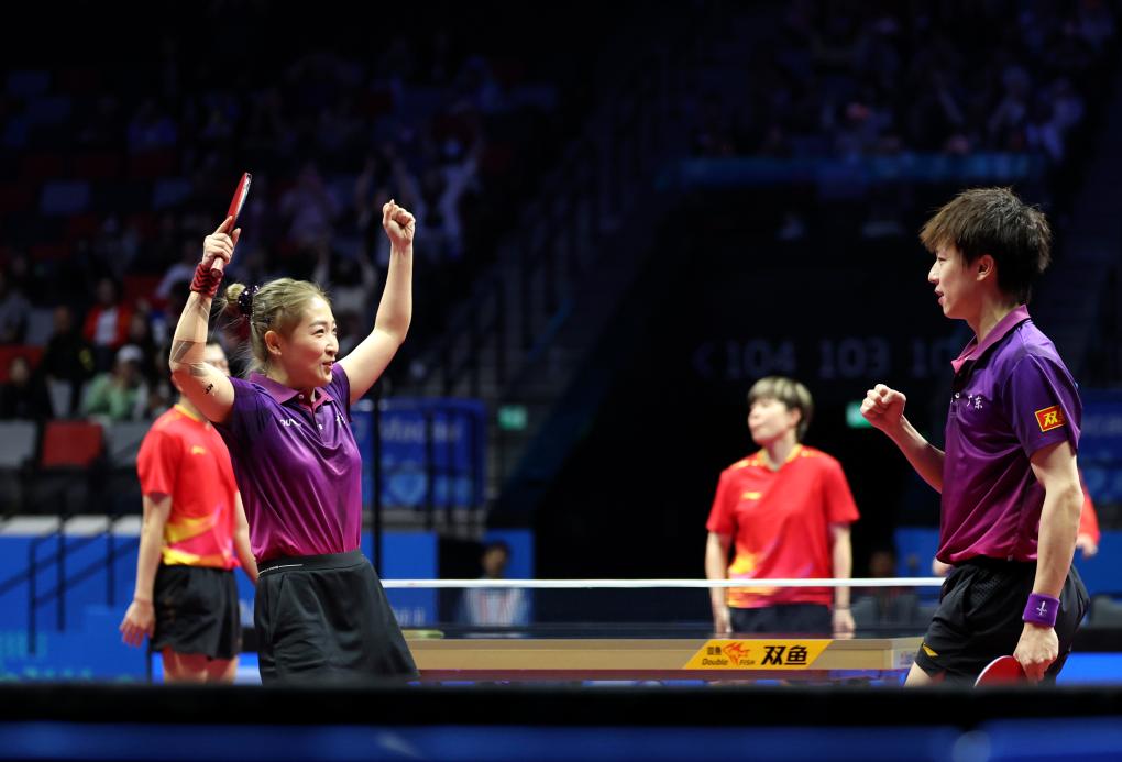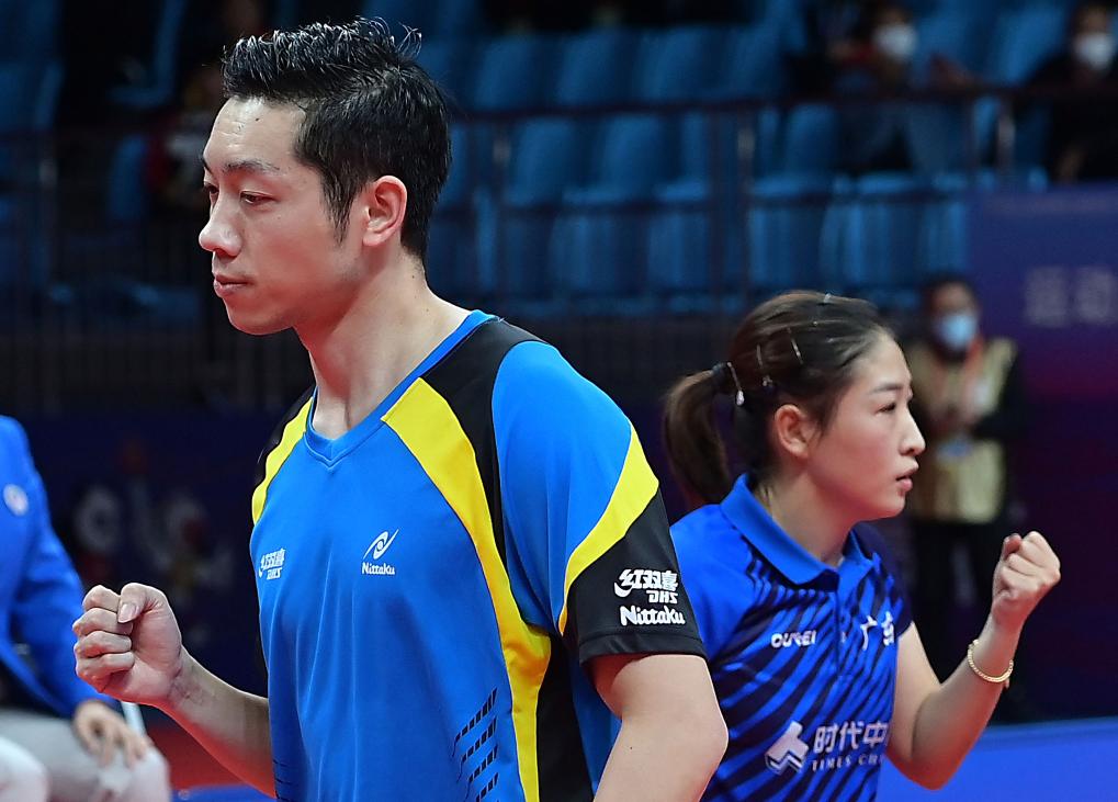 2021年9月24日,联合队组合许昕(左)/刘诗雯在比赛中庆祝。 当日,在陕西延安进行的第十四届全运会乒乓球项目混合双打决赛中,联合队组合许昕/刘诗雯以4比2战胜黑龙江队组合曹巍/王曼昱,获得冠军。 新华社记者 李安 摄