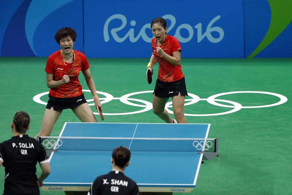 2016年8月16日,中国选手丁宁(左上)/刘诗雯(右上)得分后庆祝。 当日,在2016年里约奥运会乒乓球女子团体赛决赛中,中国队以3比0战胜德国队获得金牌。 新华社记者 沈伯韩 摄