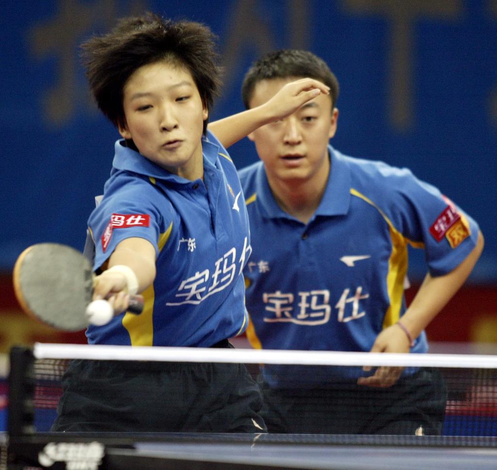 2005年10月15日,广东队选手马琳/刘诗雯(左)在第十届全国运动会乒乓球混双比赛中。最终,马琳/刘诗雯以2比3负于天津队选手郝帅/唐娜,无缘晋级。新华社记者 毕明明 摄