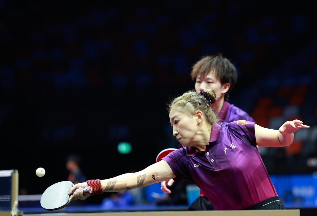 2025年11月13日,林高远/刘诗雯(前)在第十五届全国运动会乒乓球混合双打半决赛中。新华社记者 梁旭 摄