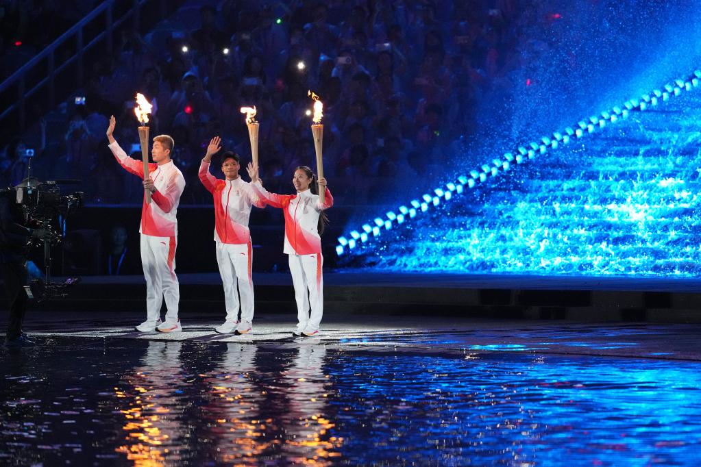 11月9日,火炬手张家朗(左一)、苏炳添(左二)和李祎在第十五届全国运动会开幕式上。新华社记者 李一博 摄