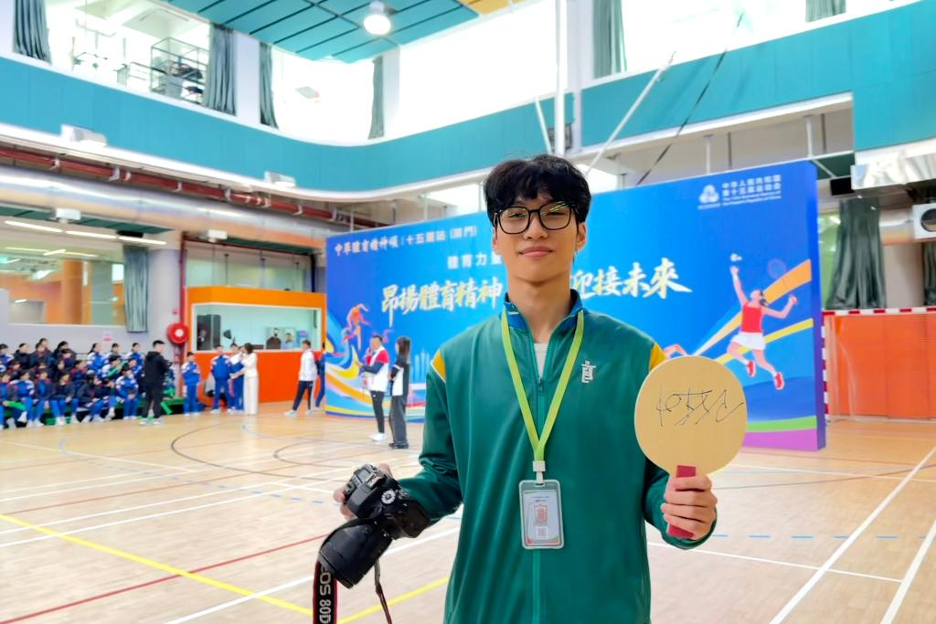 圣若瑟教区中学第六校高三学生陈傲扬在问答环节获得了一支由世界冠军签名的乒乓球拍。“这个球拍很珍贵,我会把它放在收藏柜里。成为世界冠军一定付出了很多努力,这个拍子也激励我要向着我的梦想前进。”他说。