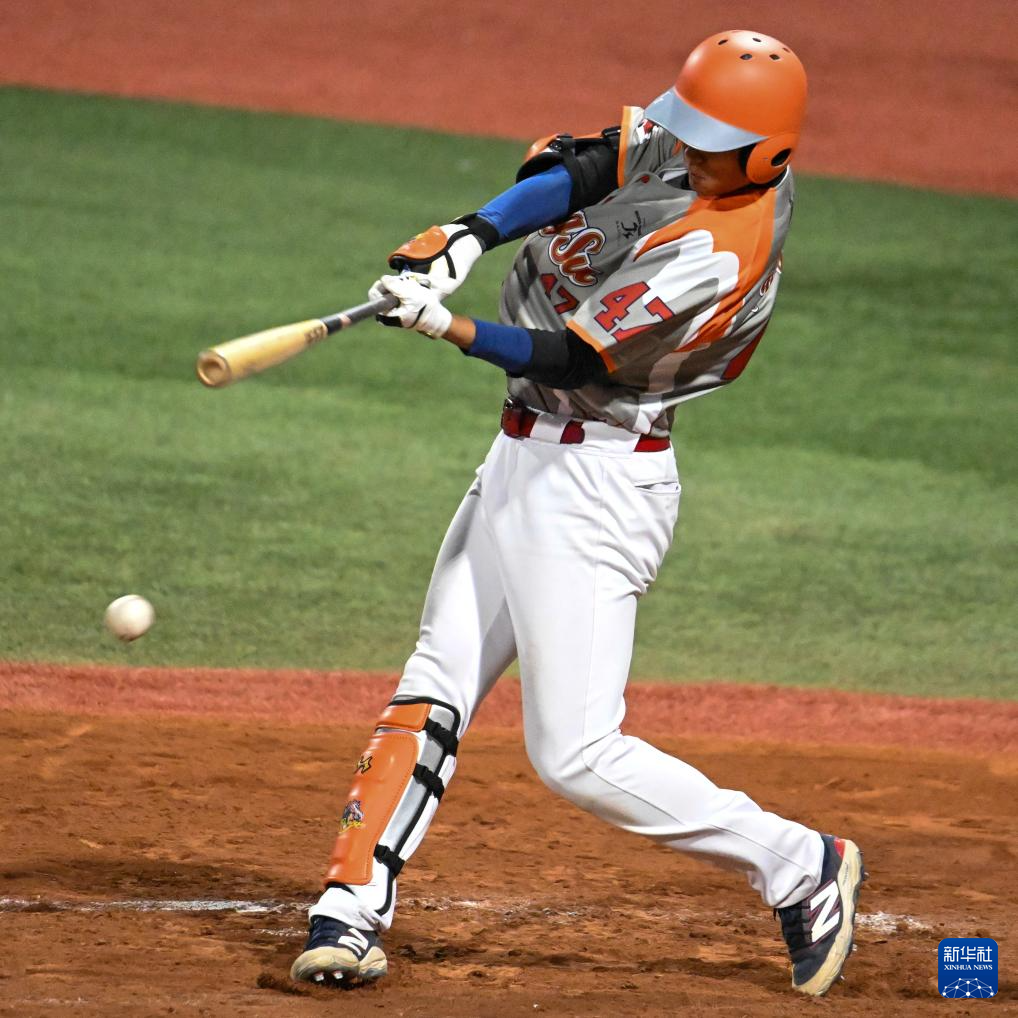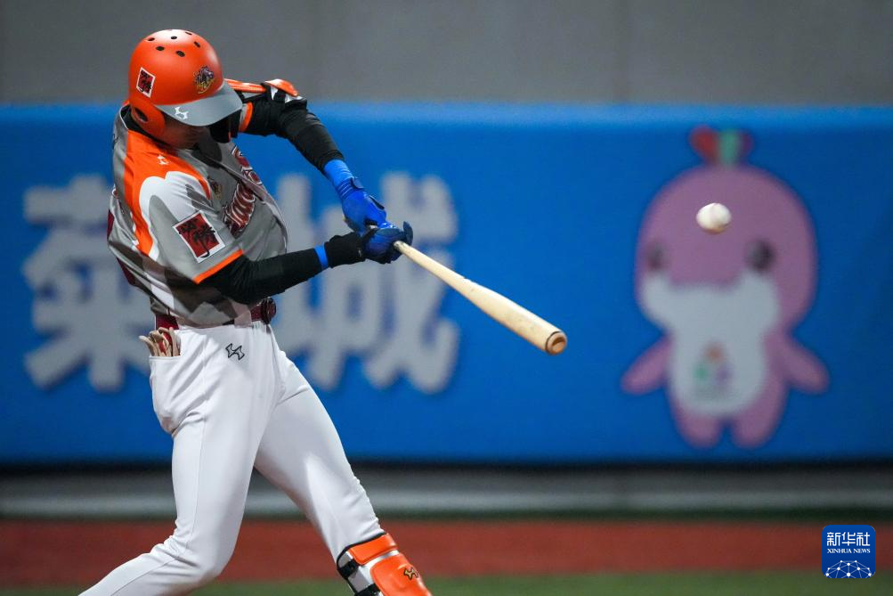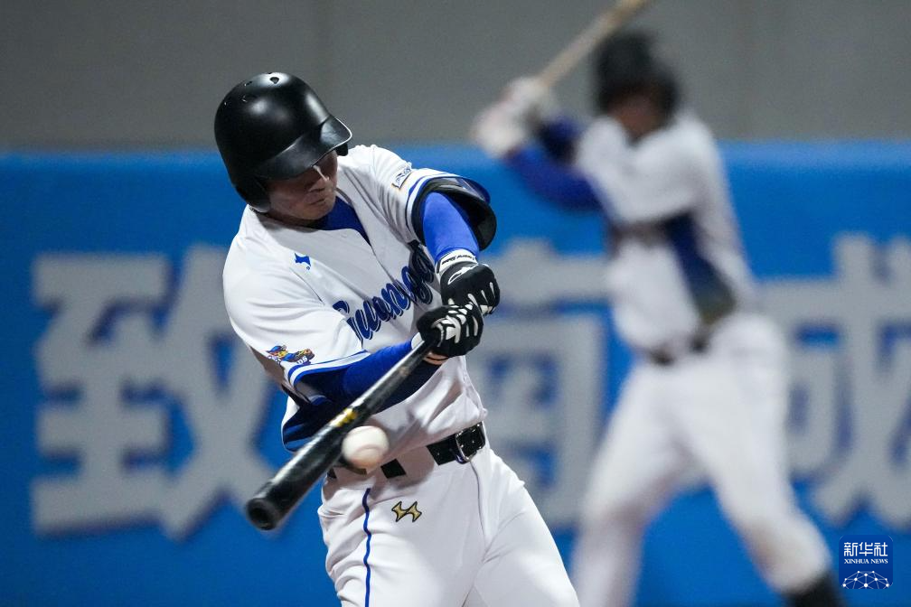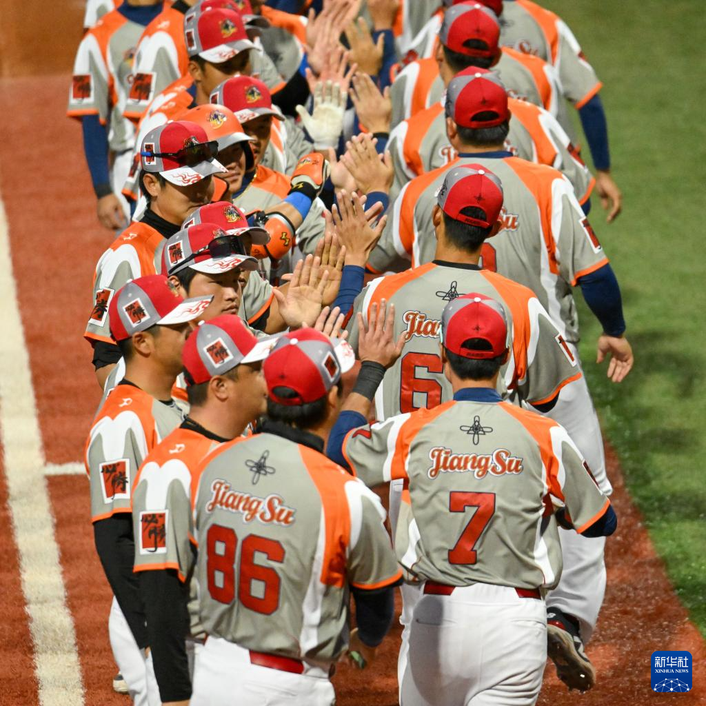 11月20日,江苏队球员庆祝队友陈晨(左二)在比赛中打出本垒打。