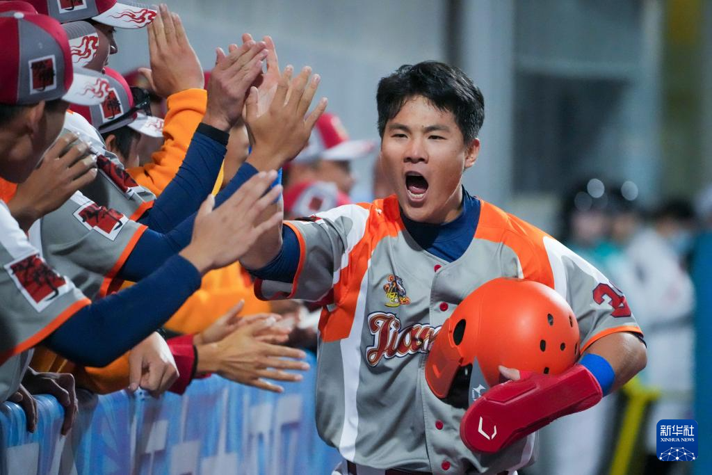 11月20日,江苏队球员庆祝队友在比赛中打出本垒打。