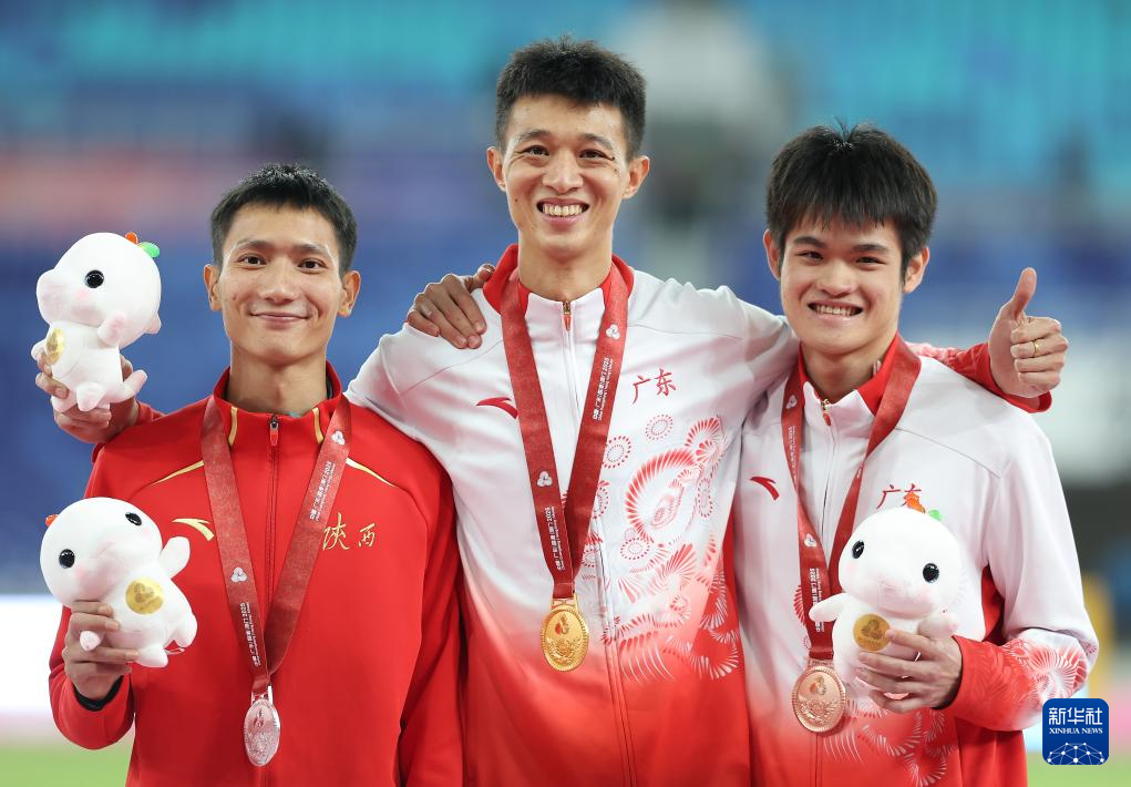 11月20日,获得冠军的广东队选手吴瑞庭(中)、获得亚军的陕西队选手方耀庆(左)、获得季军的广东队选手周荣嘉在颁奖仪式上合影。