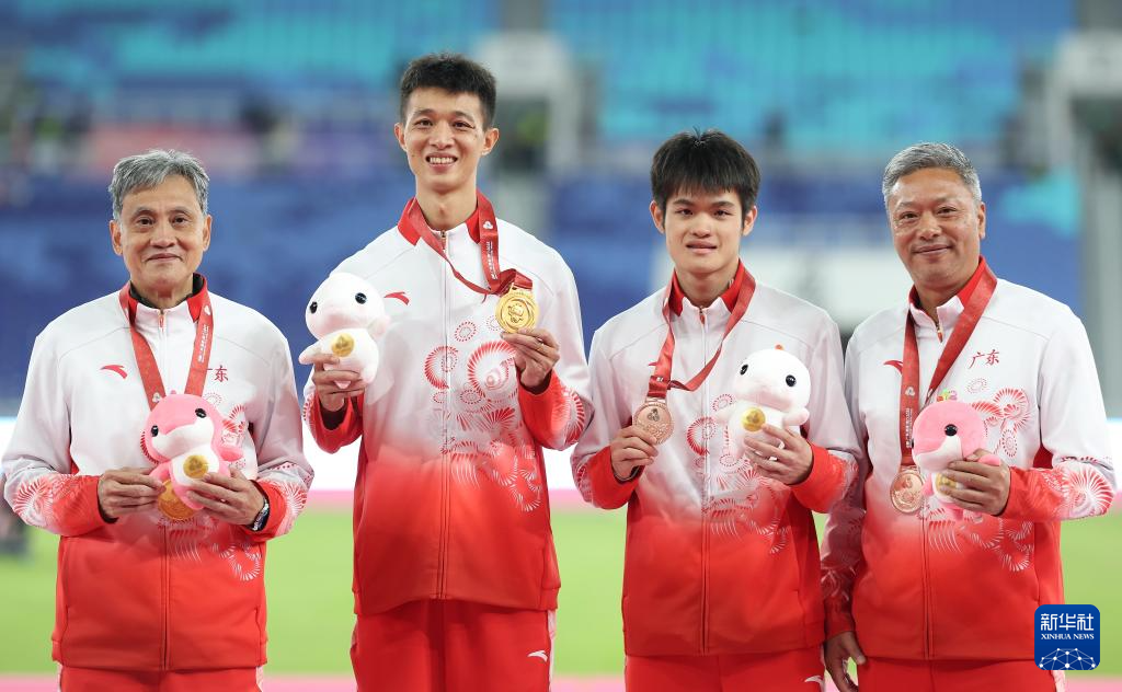11月20日,获得冠军的广东队选手吴瑞庭(左二)、获得季军的广东队选手周荣嘉(右二)在颁奖仪式上与教练合影。