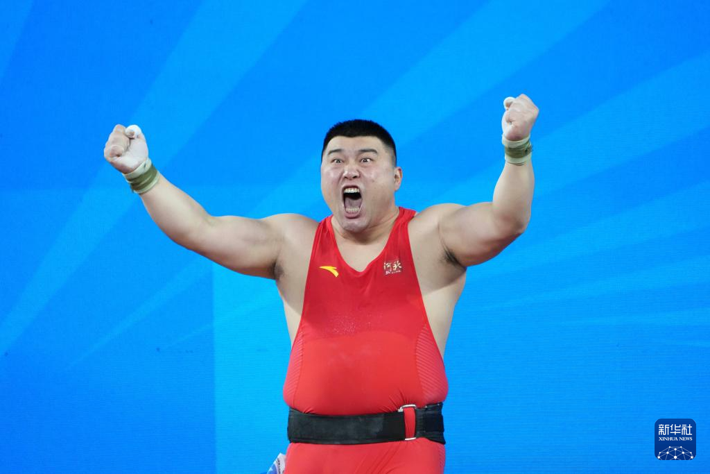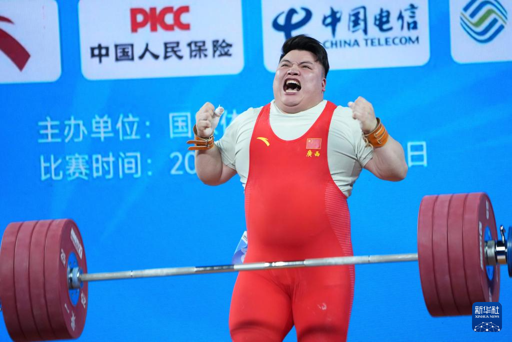 11月20日,广西队选手梁敏华在挺举比赛中试举成功后庆祝。最终,他获得亚军。