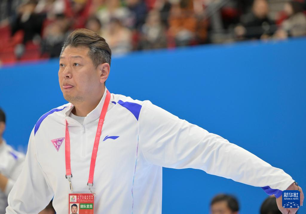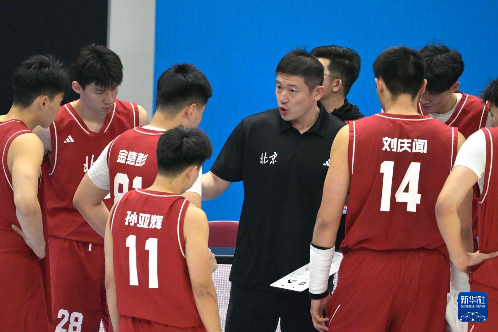 11月20日,北京队主教练陈磊(左二)在比赛间隙指导球员。