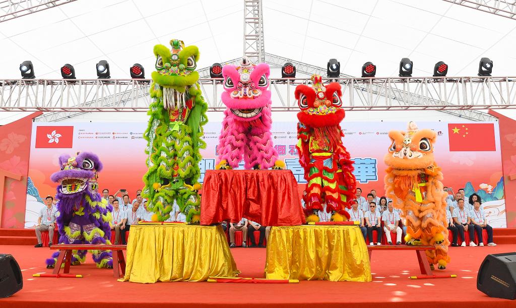 6月1日,在香港举办的第三届“家乡市集嘉年华”开幕式上,演员在表演舞狮。