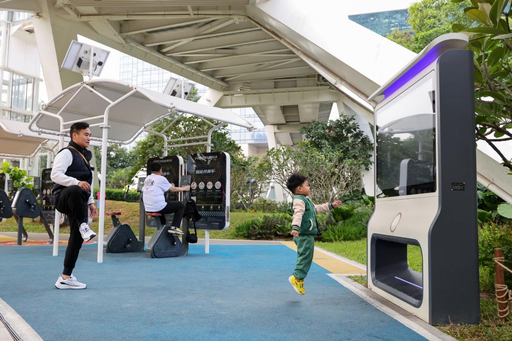 2024年12月27日,在深圳笔架山公园里,小朋友和家长一起使用智能互动屏锻炼身体。
