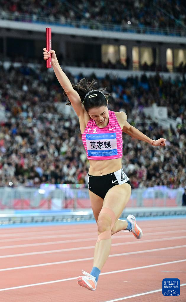 当日,第十五届全国运动会田径项目女子4X400米接力决赛在广州举行。