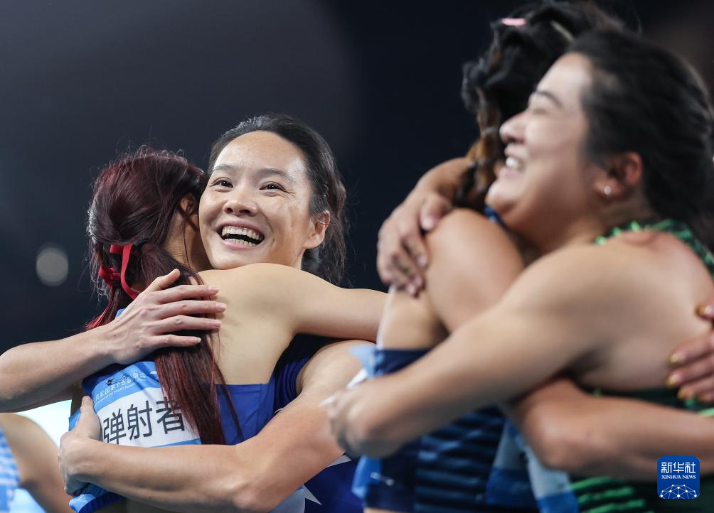11月20日,湖北队选手许佳璐(后左)与广西队选手韦永丽(后右)在比赛后拥抱。湖北队获得冠军。