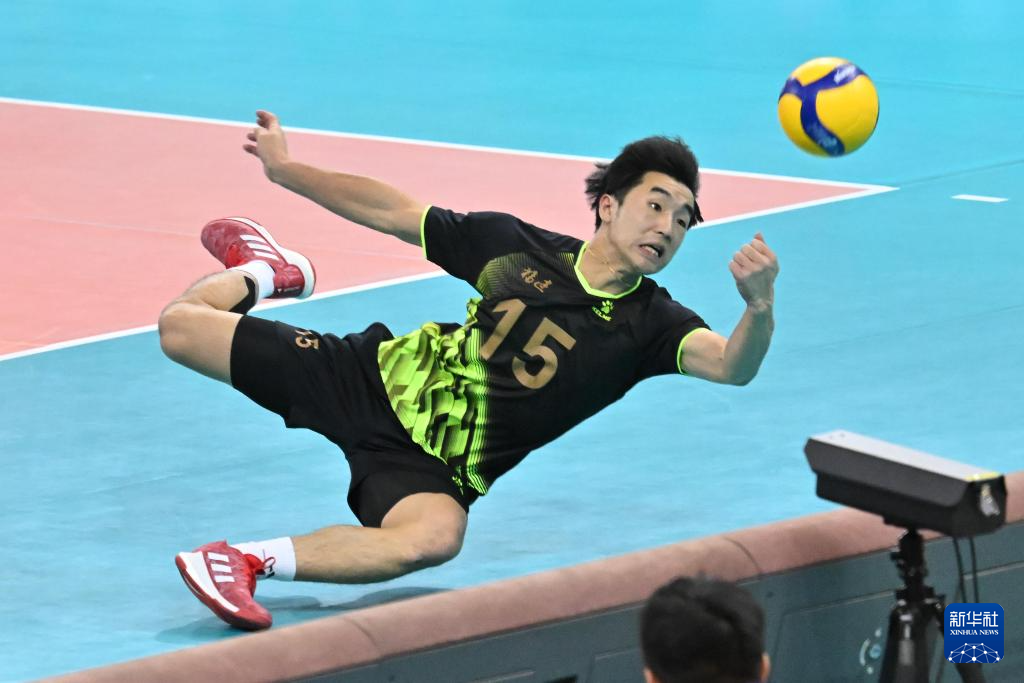 当日,在广东江门举行的第十五届全国运动会排球男子成年组冠亚军决赛中,福建队对阵山东队。