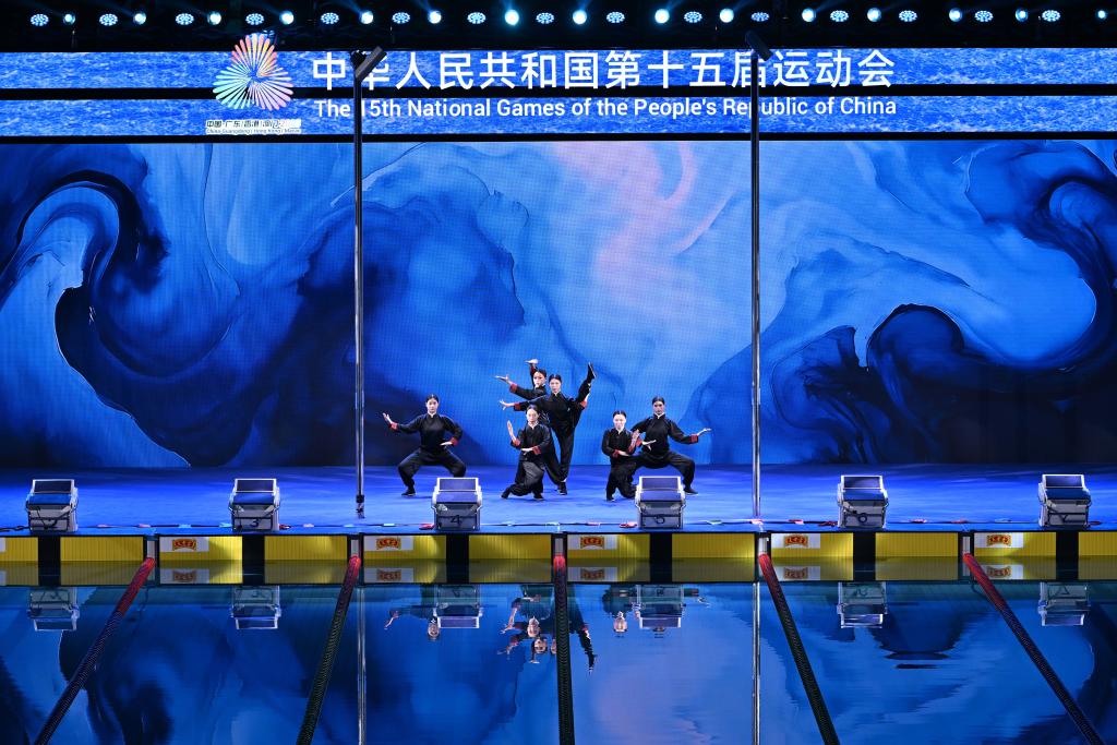 ↑11月15日,演员在第十五届全国运动会游泳女子100米自由泳决赛开始前表演。新华社记者 陈益宸 摄