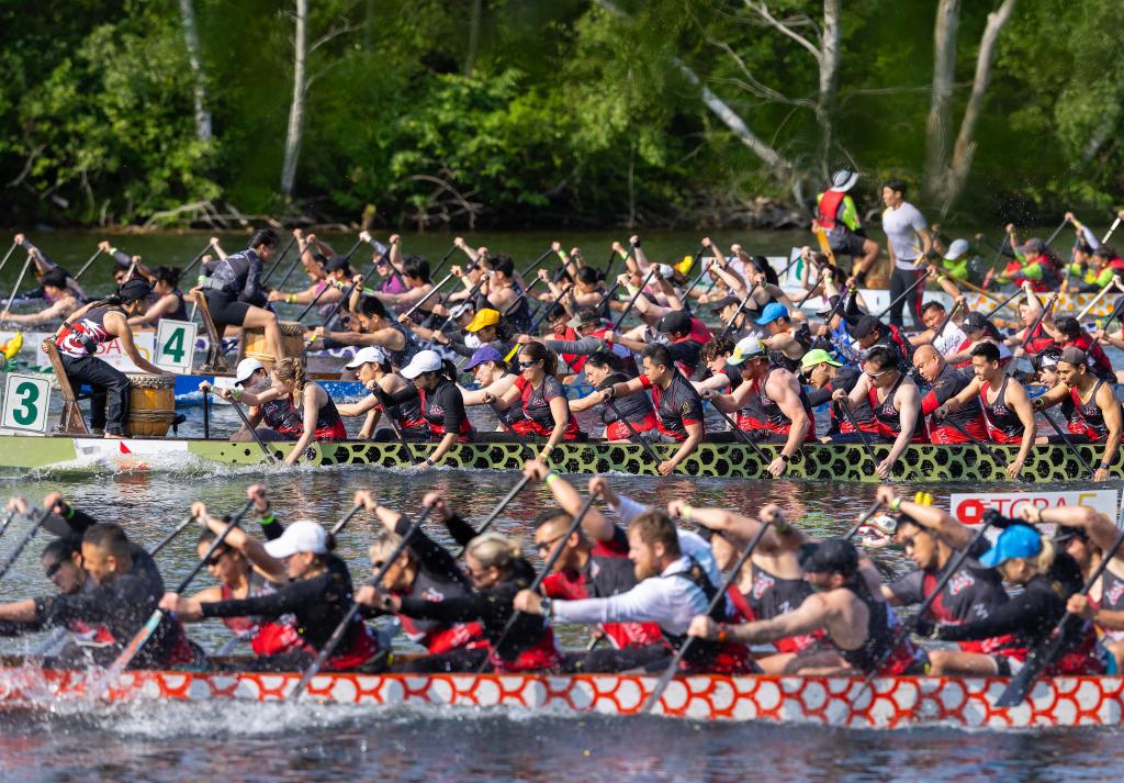 ↑6月14日,参赛者在龙舟节上竞渡。当地时间6月14日至15日,加拿大多伦多举办2025年国际龙舟节。新华社发(邹峥摄)