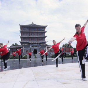 ↑8月16日,拉脱维亚学员在河南焦作市中国太极拳博物馆前练习太极单剑。新华社发(徐宏星摄)