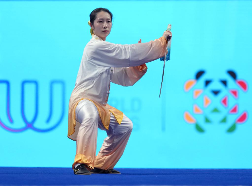 ↑8月8日,卢卓灵在太极剑比赛中。当日,在成都世运会武术项目女子太极拳-太极剑决赛中,中国选手卢卓灵夺得冠军。这是中国体育代表团在成都世运会上的首枚金牌。新华社记者 徐速绘 摄