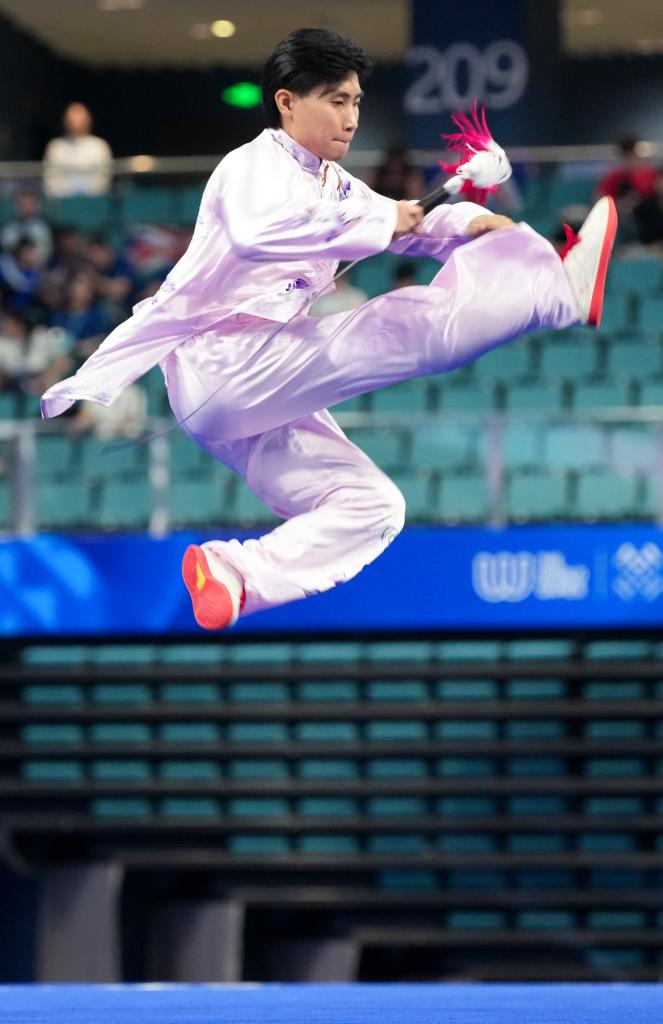 ↑8月9日,新加坡选手郑宇轩在2025年成都世运会男子太极拳-太极剑决赛太极剑比赛中。新华社记者 徐速绘 摄