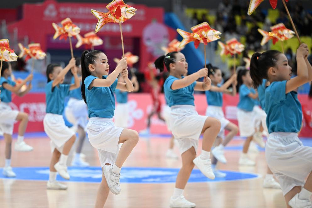 ↑11月15日,小朋友在第十五届全国运动会篮球女子成年组铜牌赛中场休息期间表演。新华社记者 邹竞一 摄