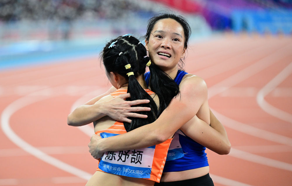 ↑11月17日,浙江队选手陈妤颉(右)和广西队选手韦永丽在第十五届全国运动会田径女子100米决赛后拥抱。她们分获冠军和亚军。