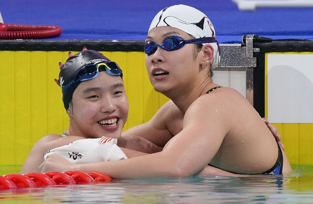 ↑11月11日,河北队选手于子迪(左)在第十五届全国运动会游泳女子200米个人混合泳决赛后与浙江队选手余依婷拥抱致意。于子迪打破亚洲纪录获得冠军,余依婷获得亚军。