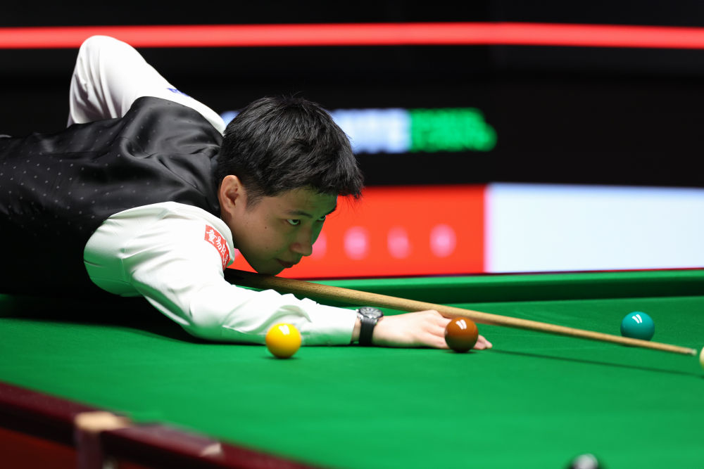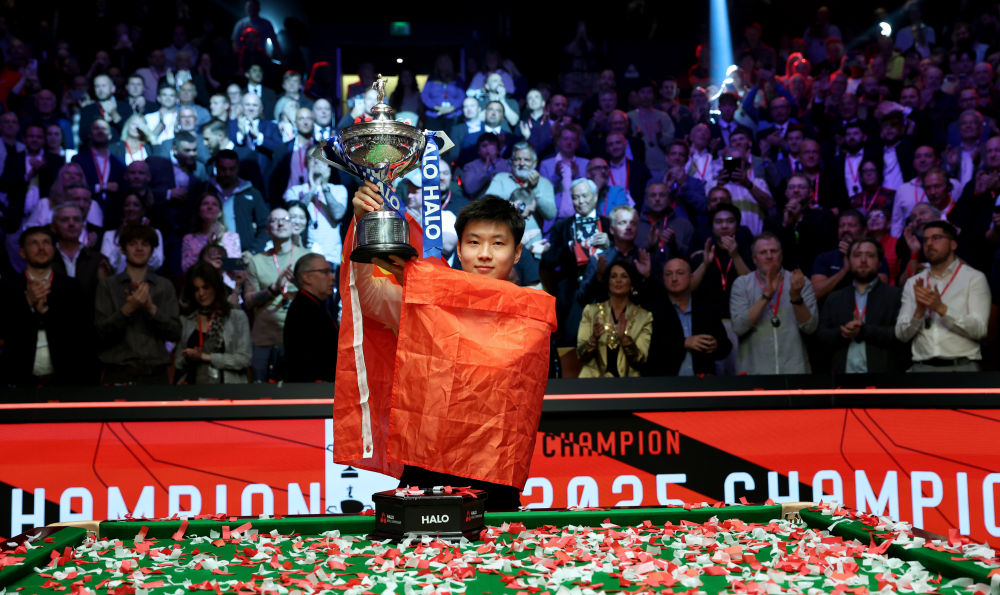 ↑5月5日,赵心童在2025年斯诺克世锦赛决赛中。他成为首位获得该项赛事冠军的亚洲选手。