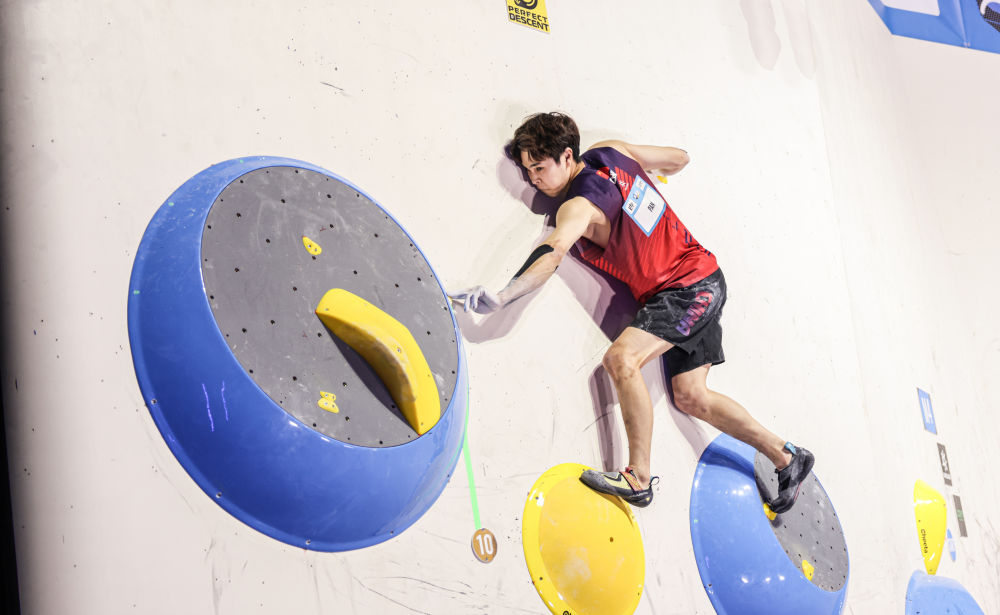 ↑6月15日,潘愚非在2025年攀岩世界杯伯尔尼站决赛中。