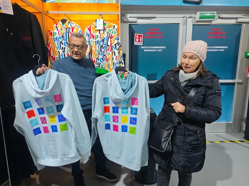 位于米兰大教堂广场的冬奥会官方纪念品旗舰店,是人们感受赛事临近最直观的窗口。在这里,记者遇到了一对米兰本地老夫妇——毛里齐奥和洛雷娜。他们选购了一件印有米兰冬奥会全项目图案的纪念衫,作为对这届冬奥会的纪念。“我们最喜欢的项目是高山滑雪,”洛雷娜说,“不过相比去现场,还是在电视上看比赛更清楚。”