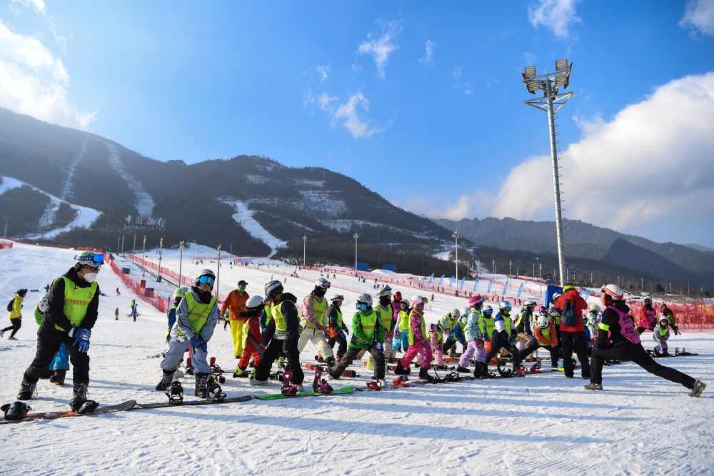 ↑2023年1月11日,滑雪冬令营学员在陕西太白鳌山滑雪度假区教练的带领下热身。