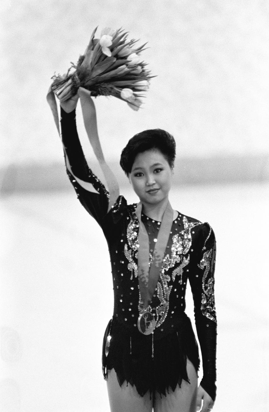 ↑1994年2月25日,陈露在利勒哈默尔冬奥会花样滑冰女子单人滑领奖台上。