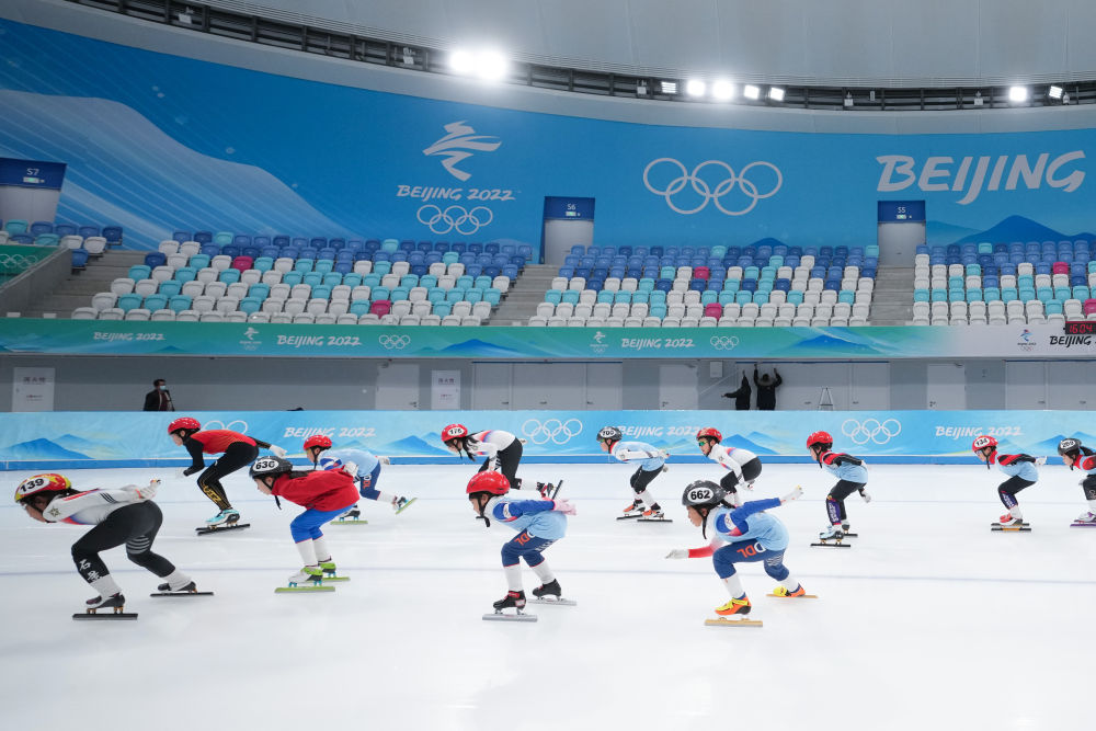 2023年1月6日,小朋友们在国家速滑馆进行短道速滑训练展示。新华社记者 鞠焕宗 摄