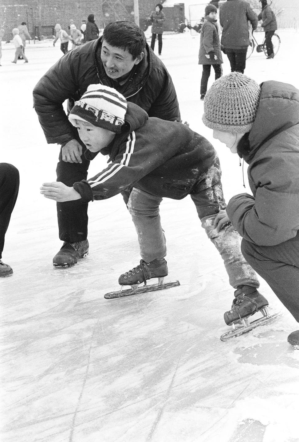 1988年11月24日,哈尔滨市百万青少年冰雪活动。这是该市清滨小学校一年级学生黄磊在体育教师的指导下,进行冰上训练。新华社记者周确摄