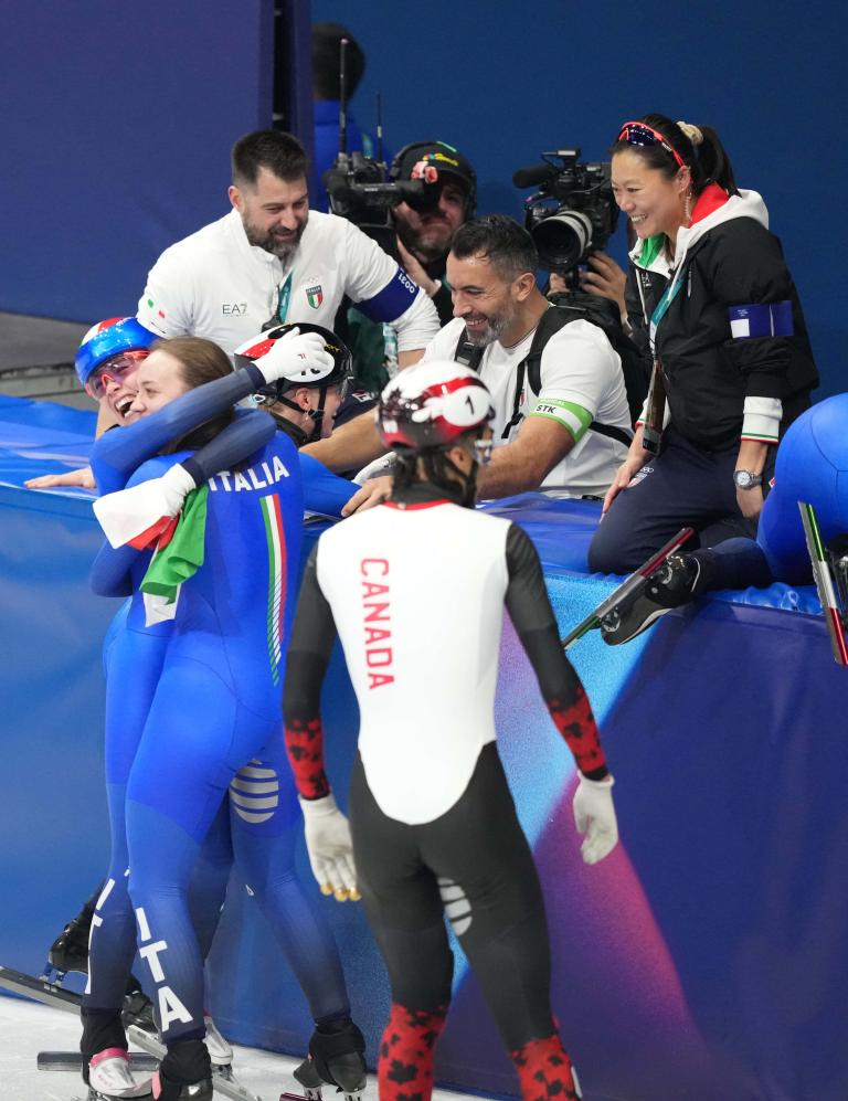新华社米兰2月10日电(记者李嘉、王镜宇)当东道主意大利队在10日的米兰冬奥会短道速滑赛场夺得2000米混合接力冠军时,现场沸腾了。冰场边庆祝的人群中,有一张中国面孔格外醒目——她眼含热泪,高喊着“Italia,brava!(意大利,太棒了!)”,在冰面旁挨个拥抱队员。