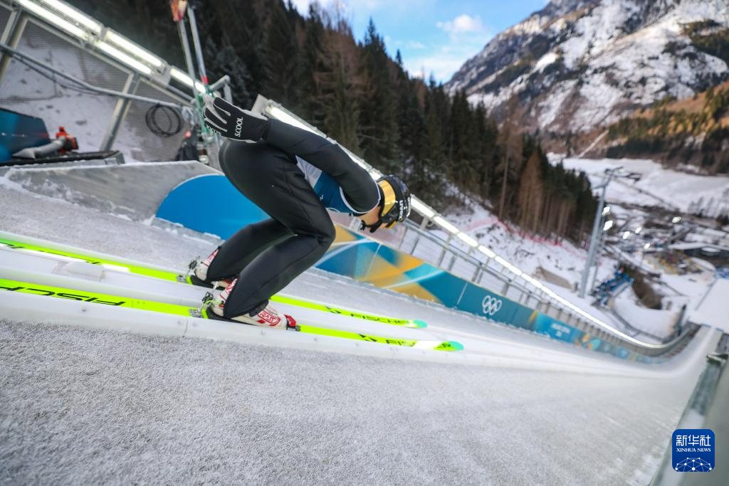 2月17日,中国选手赵子贺在北欧两项个人大跳台试跳轮中。