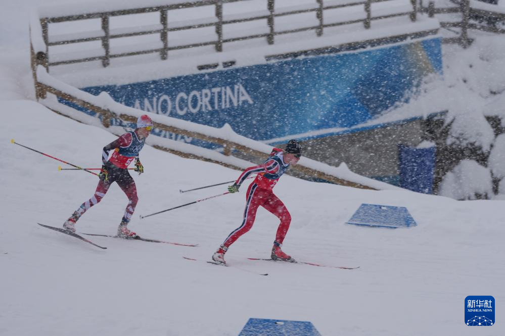 2月19日,挪威队选手奥夫特布罗(左)与芬兰选手希尔沃宁在比赛中即将冲线。