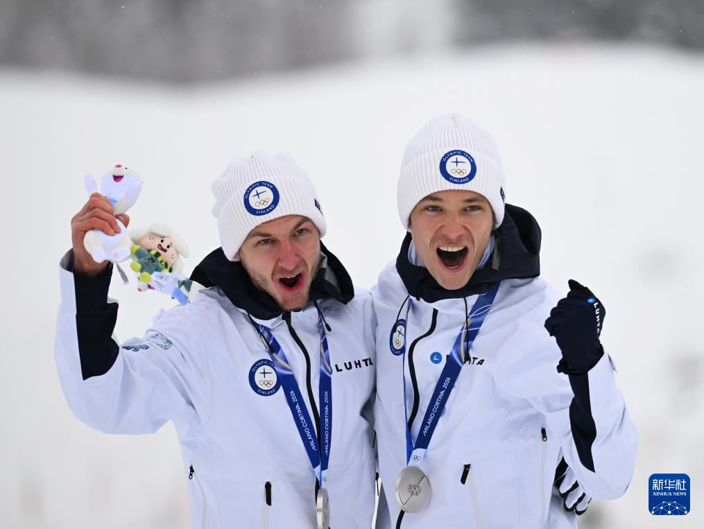 2月19日,亚军芬兰队选手海罗拉(左)与希尔沃宁在颁奖仪式上庆祝。