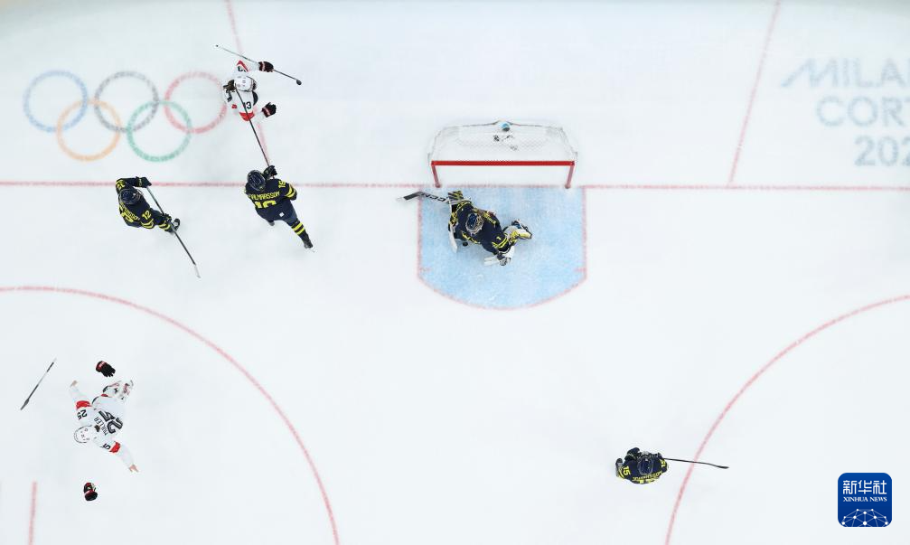 2月19日,瑞典队球员在比赛中庆祝进球。