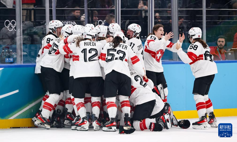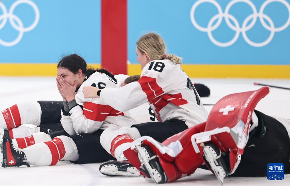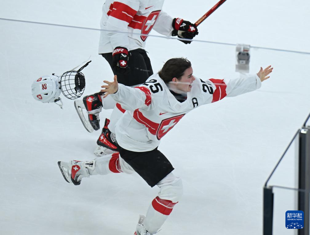 2月19日,瑞士队球员阿林娜·米勒(中)在加时赛中攻入制胜球后庆祝。