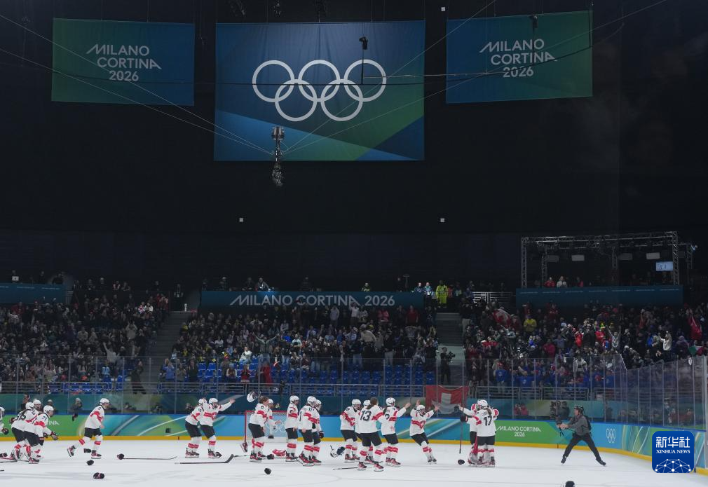 2月19日,瑞士队球员在比赛中庆祝得分。