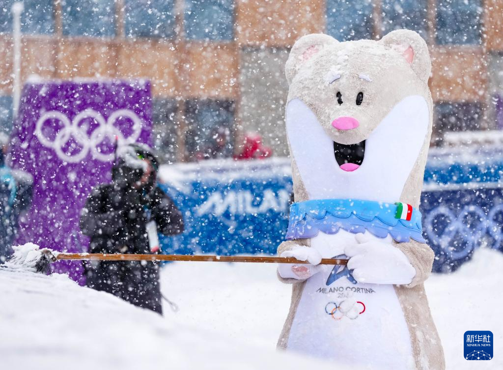 2月19日,米兰-科尔蒂纳冬奥会吉祥物“蒂娜”在比赛前清雪。