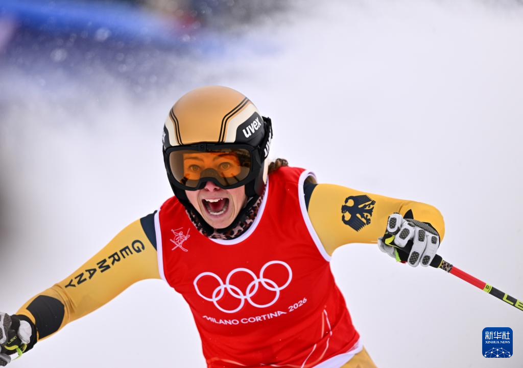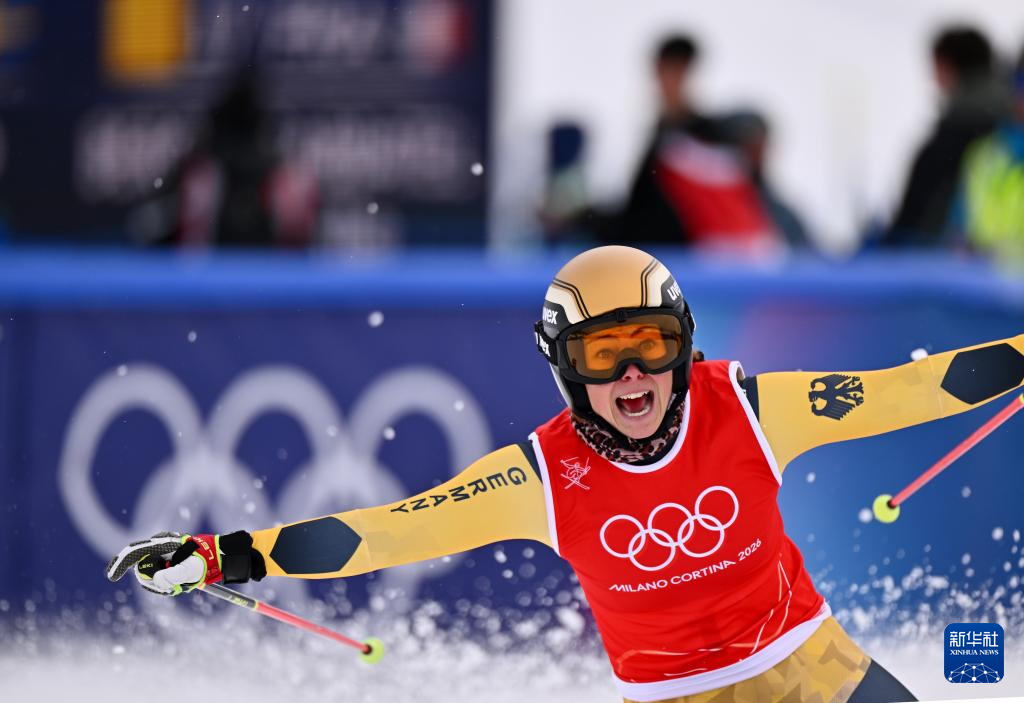 2月20日,德国选手达妮埃拉·迈尔在决赛冲线后庆祝。她获得冠军。