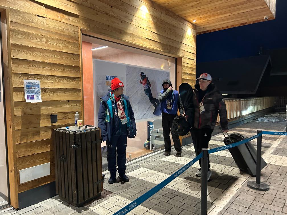 ↑在科尔蒂纳冰壶馆前的引导志愿者钟昕