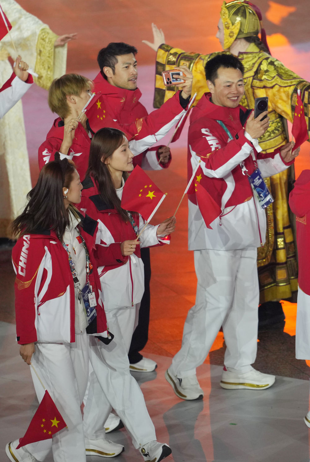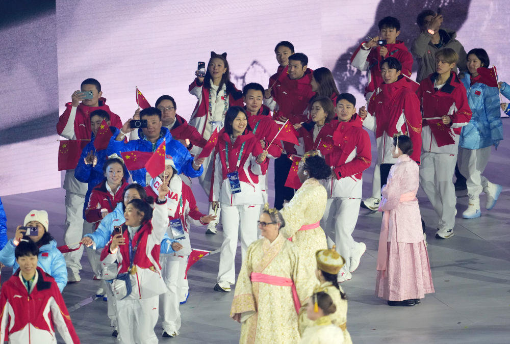 ↑中国体育代表团旗手苏翊鸣在闭幕式上入场。