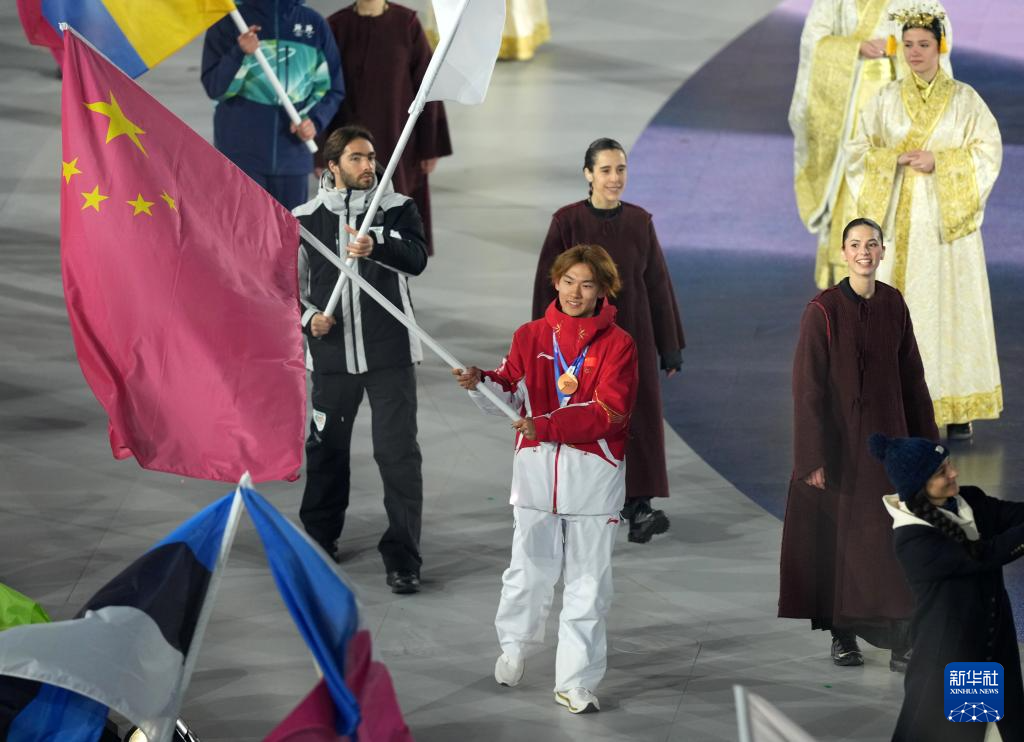 2月22日,中国体育代表团旗手苏翊鸣在闭幕式上入场。