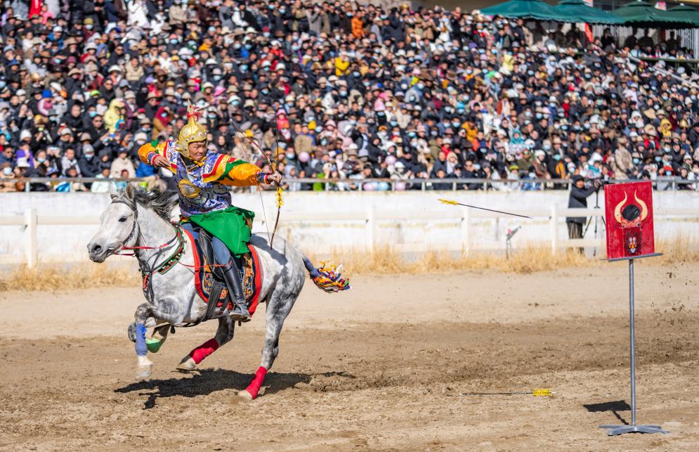 在拉萨赛马场,骑手表演马上射箭。 新华社记者 孙非 摄