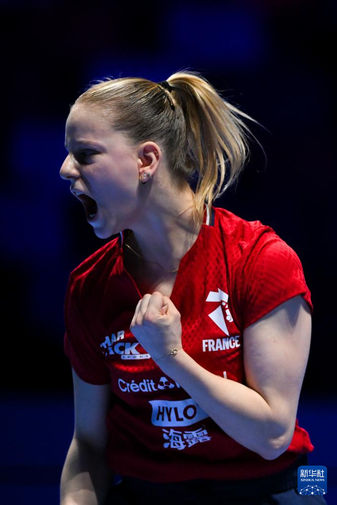 3月30日,法国选手夏洛特·卢茨在女子单打小组赛中庆祝得分。最终,她2比3不敌中国选手蒯曼。