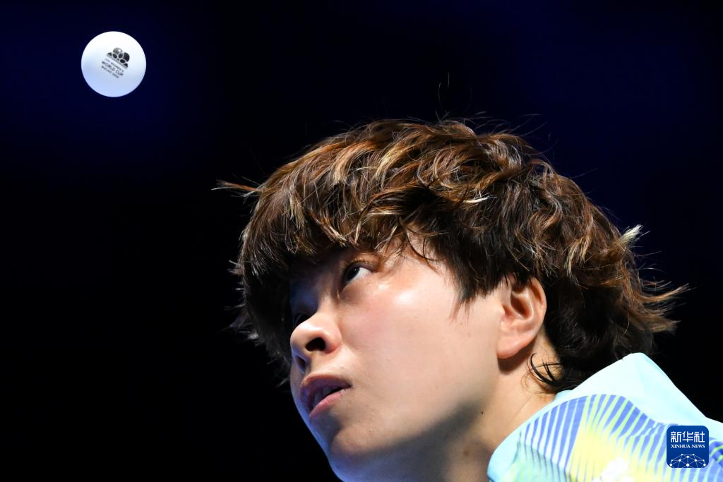 3月30日,中国选手周启豪在男子单打小组赛中发球。最终,他3比1战胜日本选手川上流星。