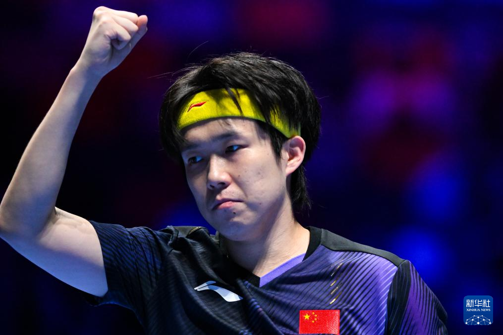 3月31日,中国选手王楚钦在比赛中庆祝得分。