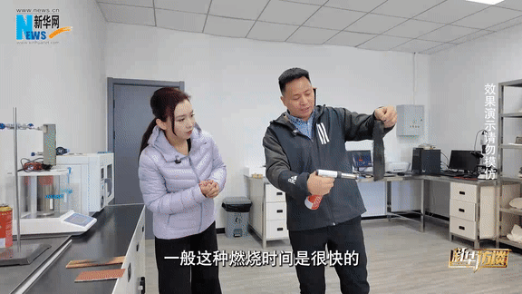 这种“扛住”的能力,在企业实验室里被反复验证:拿起一块厚度不足0.5毫米的布料,启动喷枪。喷射的高温火焰,对准布料同一点持续灼烧。十秒、三十秒、一分钟——除了有些发烫以外,布料没有冒烟,没有碳化,甚至没有变色,“烧完以后,强度也基本不丢失。”翁时铭说。